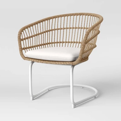 • White steel frame and beige wicker details make for a chic and bold aesthetic