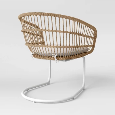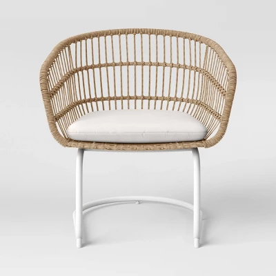 Chat over coffee with a friend with the Southport 3-Piece Motion Chat Set from Opalhouse™. This lovely patio furniture set comes with two armchairs with seat cushions and one accent table. The set perfectly accommodates two people and is great for entertaining guests or spending time with family. The pieces feature a white steel frame with beige wicker details that make for a chic and bold aesthetic. These classic colors match easily with any design themes you prefer. Pair with bright and bold colors for a playful space or with neutral colors for a space that is sleek, modern and calming. The rust-, water- and weather-resistant properties mean you can enjoy your outdoor space without worrying about maintenance.